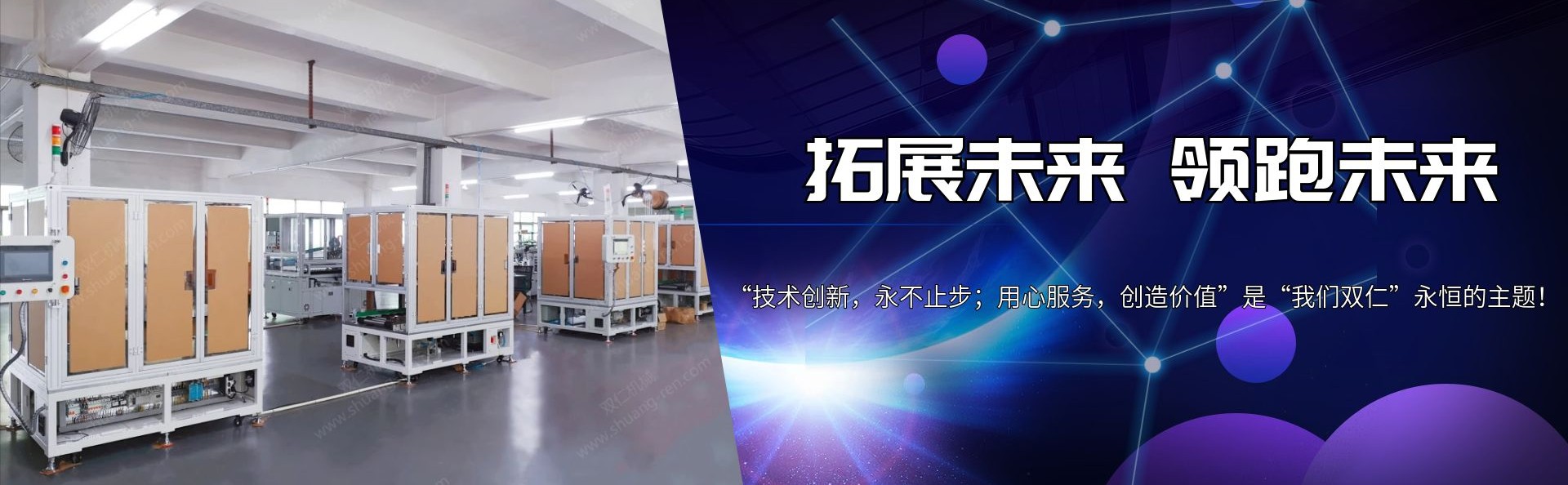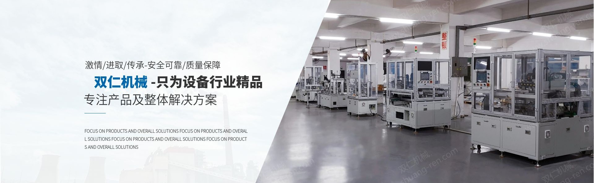 “東莞市雙(shuang)仁機械設備(bei)科技有限公(gong)司” 始創于2010年(nián)7月,是一家集(jí)研發、制造、服(fú)務于一體的(de)專業锂電池(chi)自動化生産(chan)設備的公司(si)。 擁有方形鋁(lǚ)殼動力電池(chí)、軟包裝電池(chí)等系列生産(chǎn)設備的研發(fa)與制造能力(li)。我們不僅僅(jǐn)制造設備,同(tóng)時也專注于(yú)配合客戶對(dui)電池生産工(gong)藝的改進,協(xié)助客戶提高(gāo)産品優率和(hé)産能;我們的(de)團隊擁有豐(feng)富的同行業(yè)實戰經驗,對(dui)電池生産工(gong)序和生産設(she)備有非常深(shen)刻的理解;希(xī)望我們的用(yong)心服務爲您(nin)創造更高價(jia)值! “技術創新(xin),永不止步;用(yòng)心服務,創造(zào)價值”是“我們(men)雙仁”永恒的(de)主題!