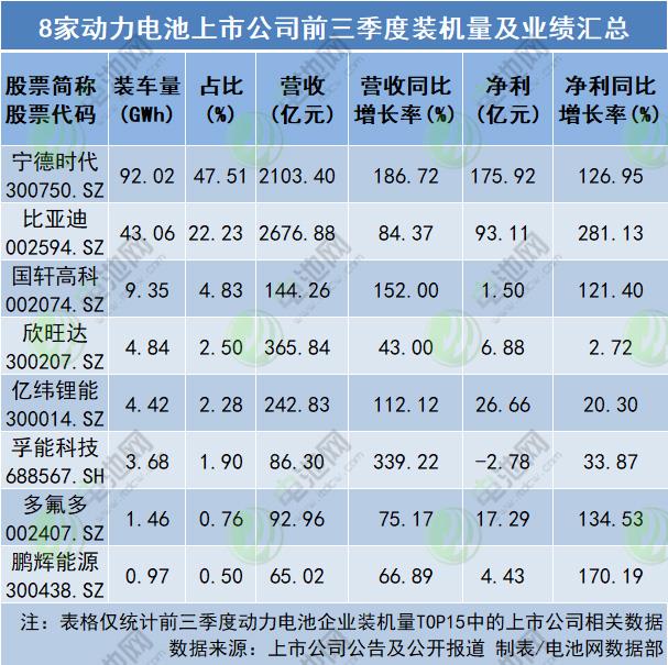 1-9月,我(wǒ)國動力電池累(lèi)計裝車量193.7GWh,累計(ji)同比增長110.5%。其中(zhōng),國内㊙️動力電池(chi)企業裝車量前(qian)十五名中上市(shi)公司9家:甯德時(shi)🤩代92.02GWh,占比47.51%;比🈲亞迪(dí)43.06GWh,占比22.23%;中創新航(hang)13.33GWh,占比6.88%;國軒🥵高科(ke)9.35GWh,占比4.83%;欣旺達4.84GWh,占(zhàn)比2.50%;億緯锂能4.42GWh,占(zhan)比2.28%;孚能科技3.68GWh,占(zhan)比1.90%;多氟多1.46GWh,占比(bi)0.76%;鵬輝☁️能源0.97GWh,占比(bǐ)0.50%。
